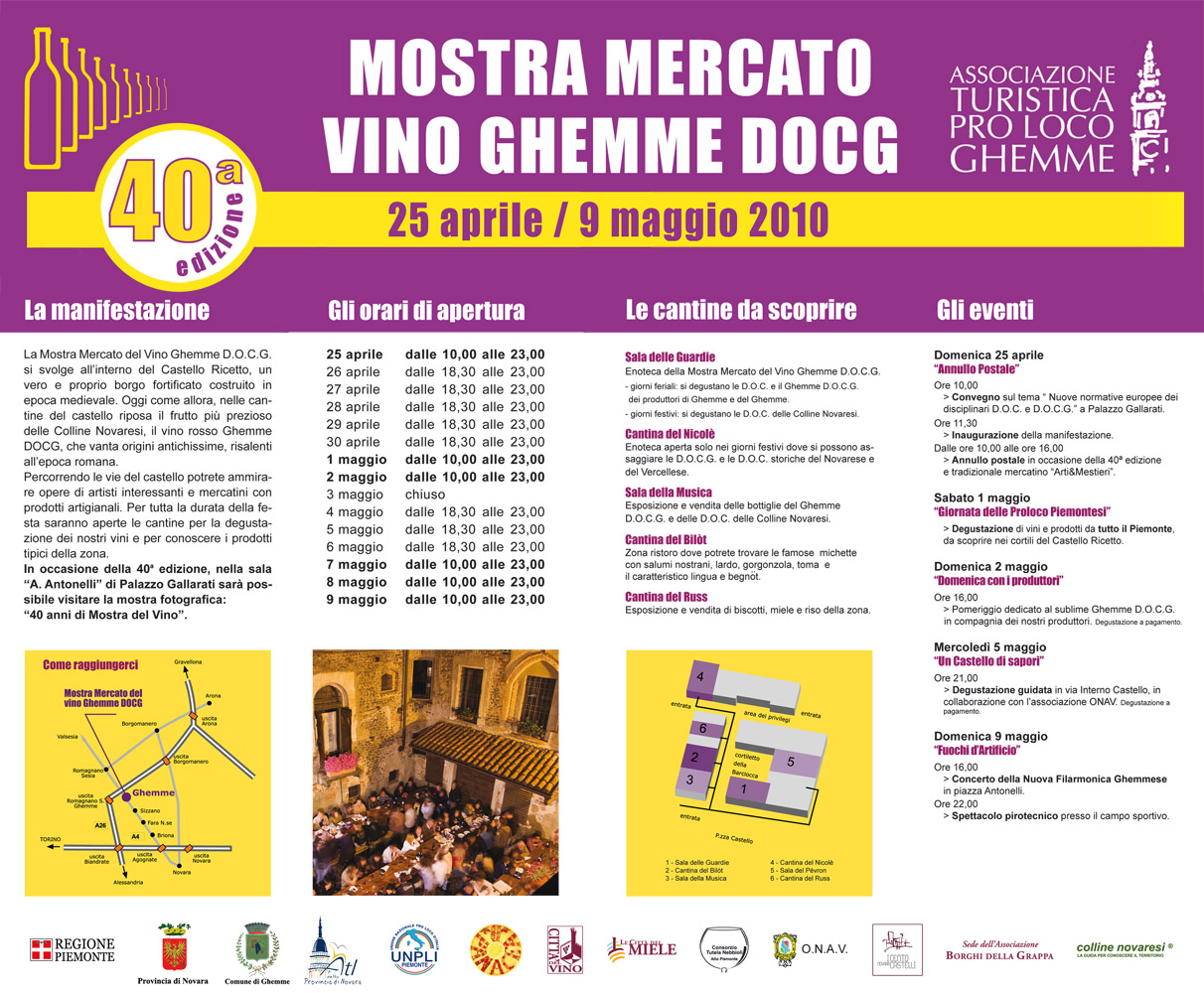 DOMENICA 25 APRILE 2010  Anche quest'anno, nella suggestiva cornice del Castello Ricetto edificato tra il secolo XI e il XV, trova spazio la Mostra mercato del vino di Ghemme.