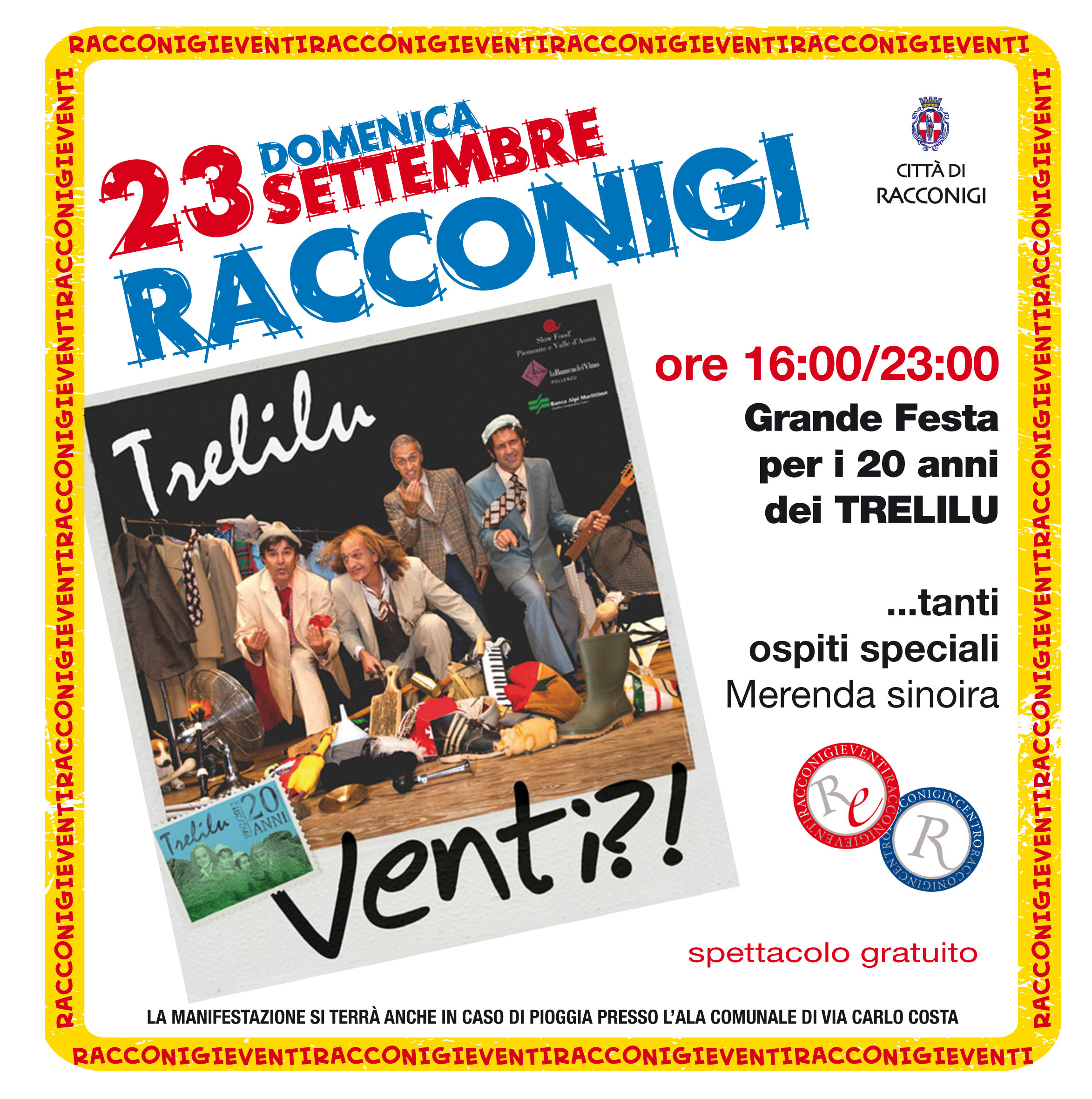 DOMENICA 23 SETTEMBRE 2012 Ala comunale Via Carlo Costa - RacconigiDalle Ore 16,30 TRELILU Festa ufficiale dei 20 anni, musica e cabaret con tanti ospiti che nell’arco della giornata verranno a fare “gli auguri” alla ormai storica formazione Piemontese Dalle ore 18,00 fino ad esaurimento scorte : “MERENDA A SINOIRA” con i prodotti “tipici” del nostro territorio. Ore 20,30 Concerto dei TRELILU INGRESSO GRATUITO