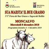 | Moncalvo: 373 ma Fiera regionale del bue grasso di Moncalvo Per Info: 347 5367607 Dalla terra alla stalla. Dal tartufo al Bue Grasso. L'eccellenza sposa la campagna e diventa nuova occasione di festa e promozione. A dicembre Moncalvo spegne simbolicamente 373 candeline della sua Fiera del Bue Grasso. Mercoledì 8 dicembre vi è l'appuntamento più atteso con la longeva (373 anni) rassegna zootecnica regionale, in cui si affollano buoi... |